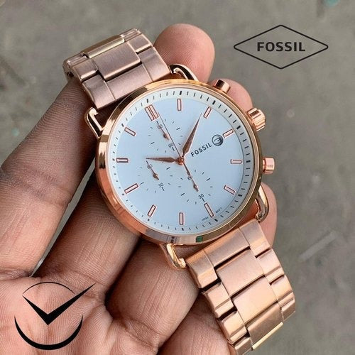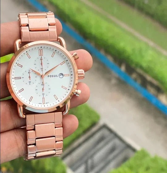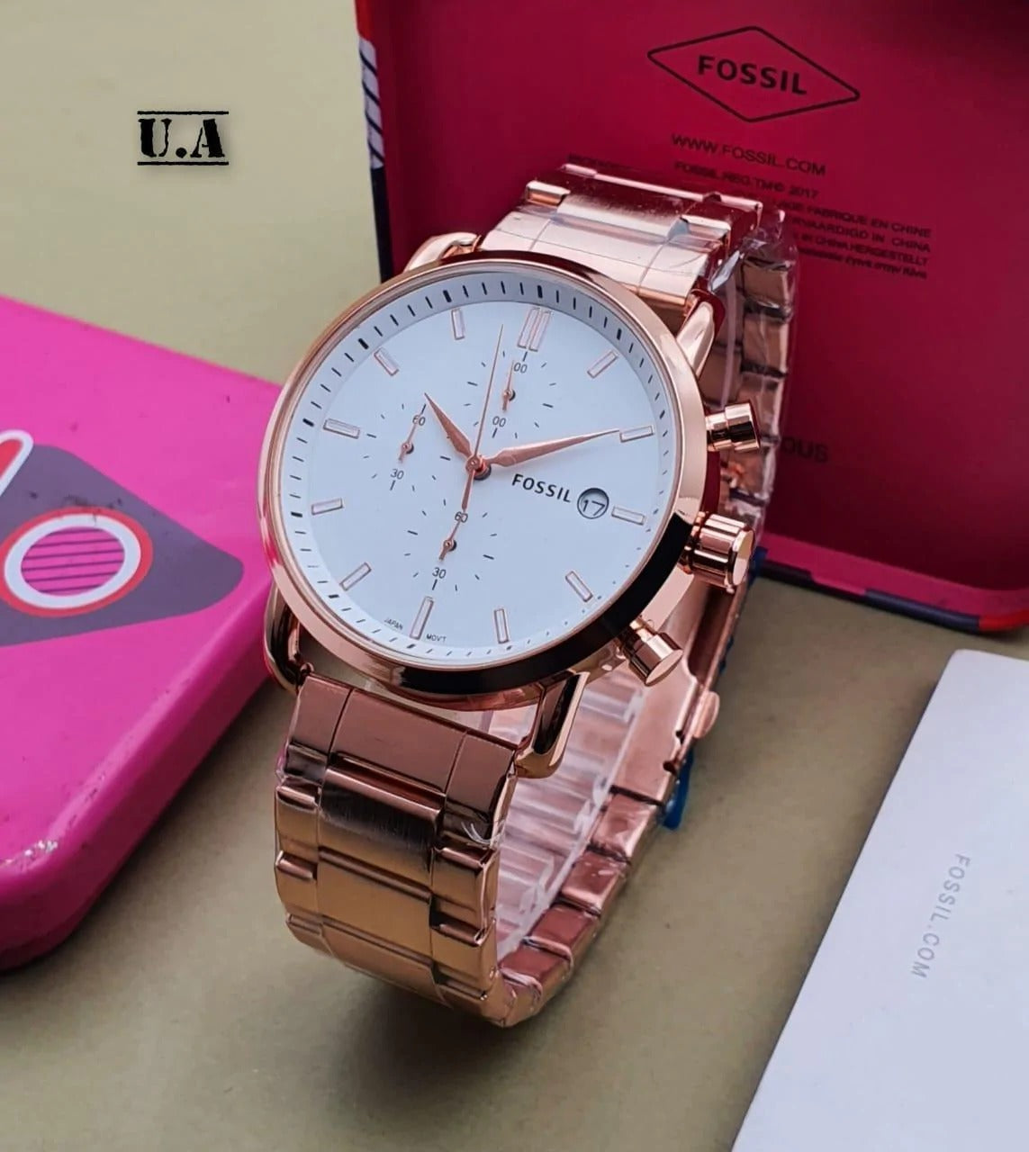 Fossil Analog Watch FS-5410-White Dial Stainless Steel Strap With Rose Gold Color Strap And White Dial Color Men;s Watch - Best Gift