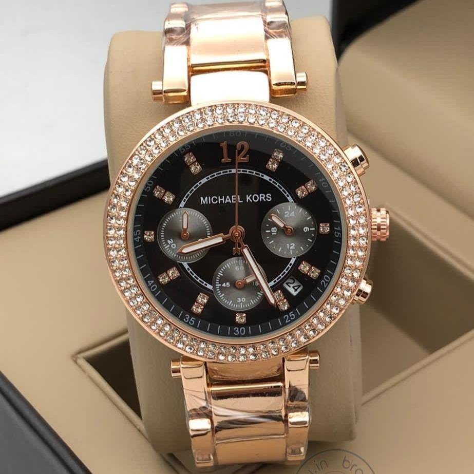 MK Gold Starp Women's Chronograph Mk-2650 Watch For Girl Or Woman Black Dial Diamond Case Date Best Gift For Women